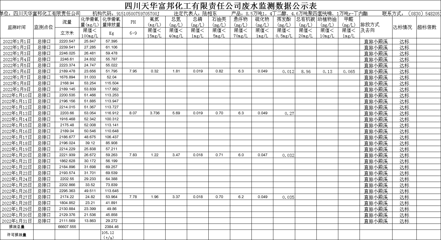 四川天華富邦有限責任公司2022年1月廢水監測公示