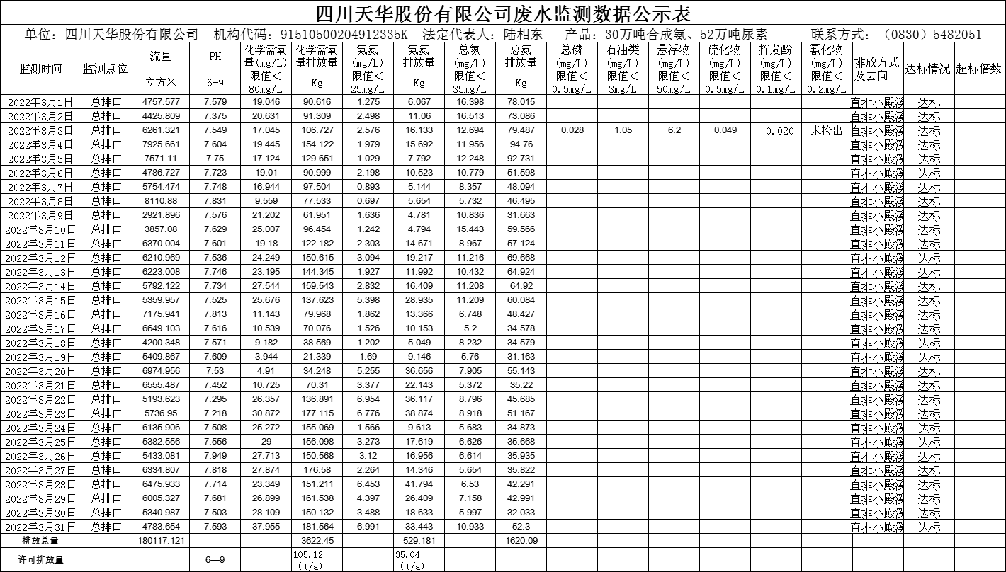 四川天華股份有限公司2022年3月廢水監測數據公示