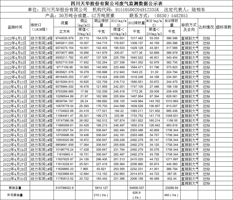 四川天華股份有限公司2022年4月份廢氣監測數據公示